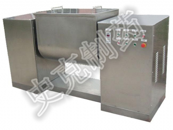 槽型混合機通過機械傳動,使S式攪拌漿旋轉,推動物料往復翻動,均勻混合,槽型混合機操作時采用電氣控制,可設定混合時間,到時自動停機,從而提高每批物料的混合質量。